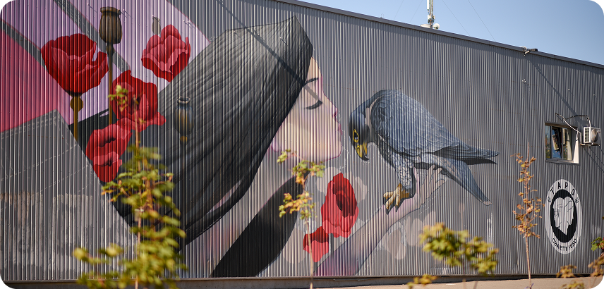 Near one of the alleys in Dnipro (8 Yurii Kondratuk St.) in 2023, artist Oleksandr Britsev created a mural — a symbol of the life and valor of defenders.